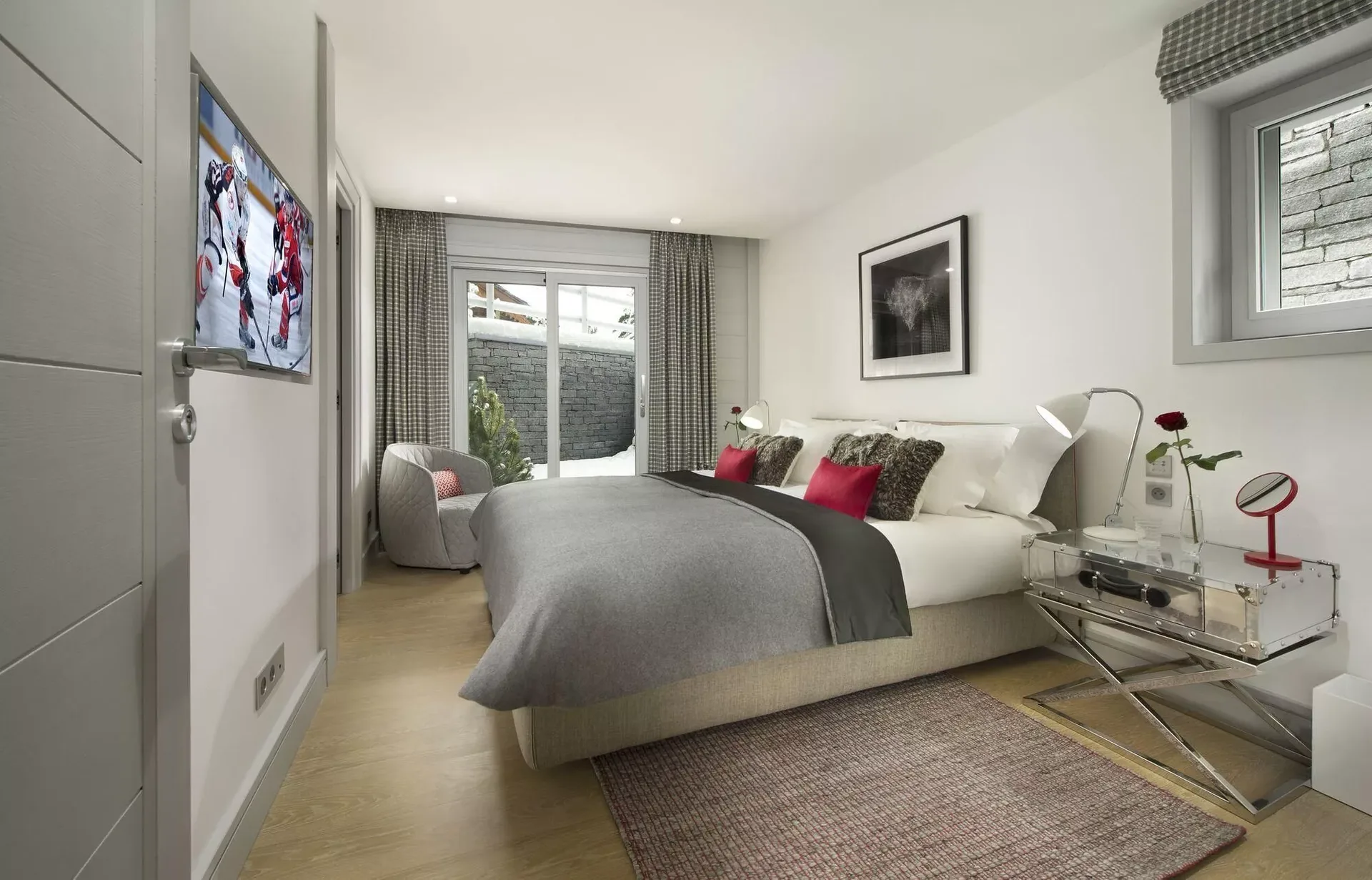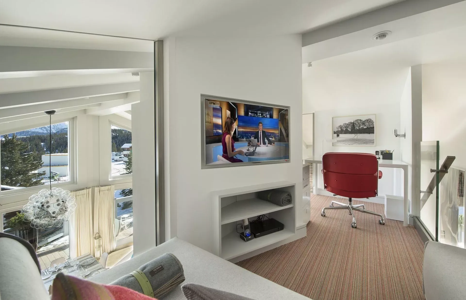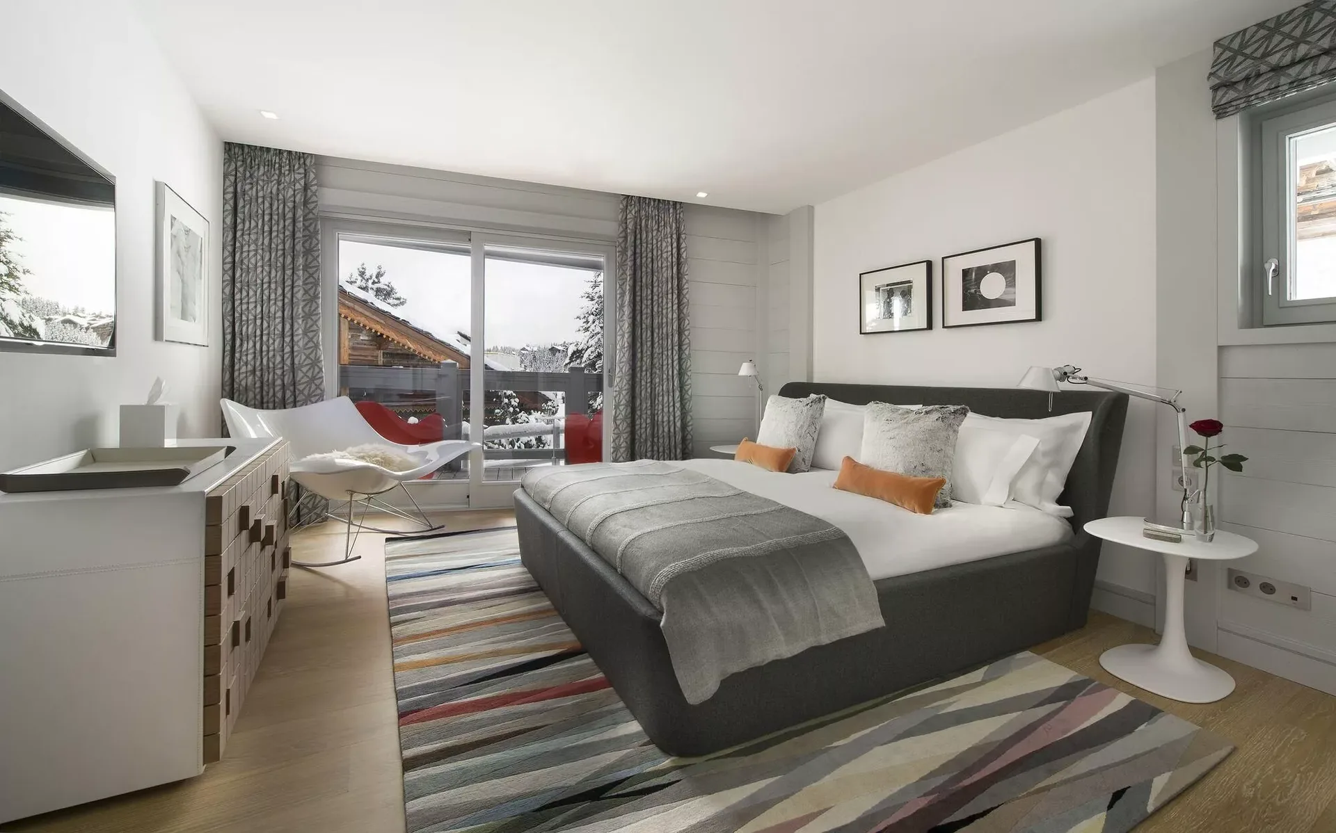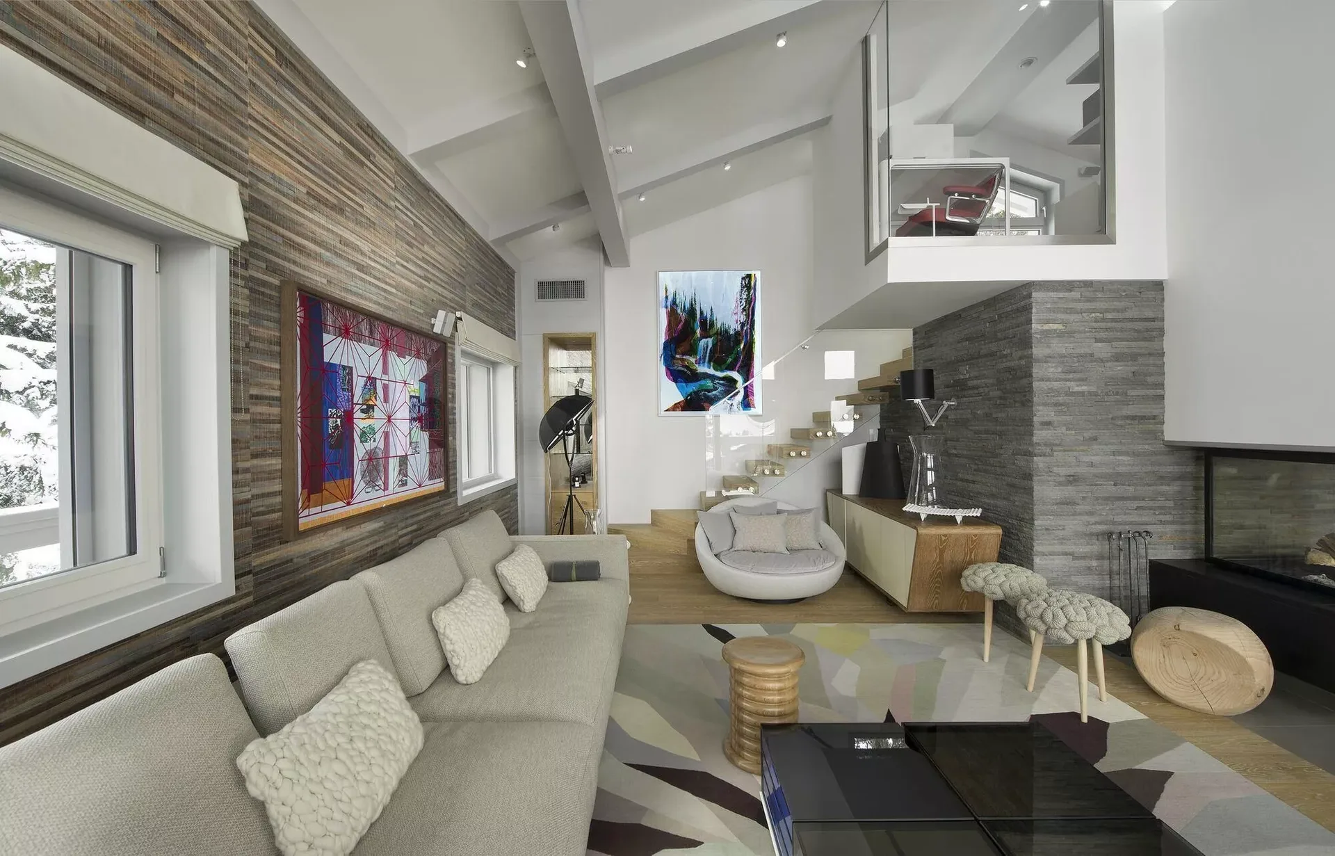 The chalet’s light grey modern silhouette blends seamlessly into the surrounding snow-covered landscape, while expansive tinted windows reflect the brilliance of the Alpine light. Inside, the décor reveals elegant Scandinavian inspirations, combining clean lines with the warmth of traditional mountain materials such as wood and stone. Knit wool cushions, graphic-patterned carpets, light woods, and designer furnishings create a refined yet inviting atmosphere.
