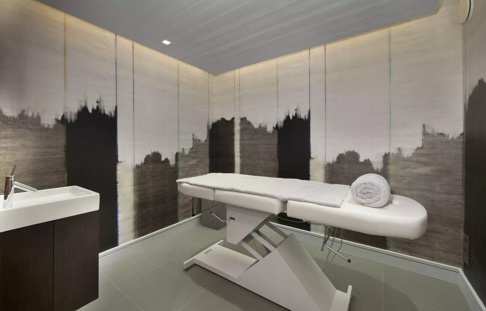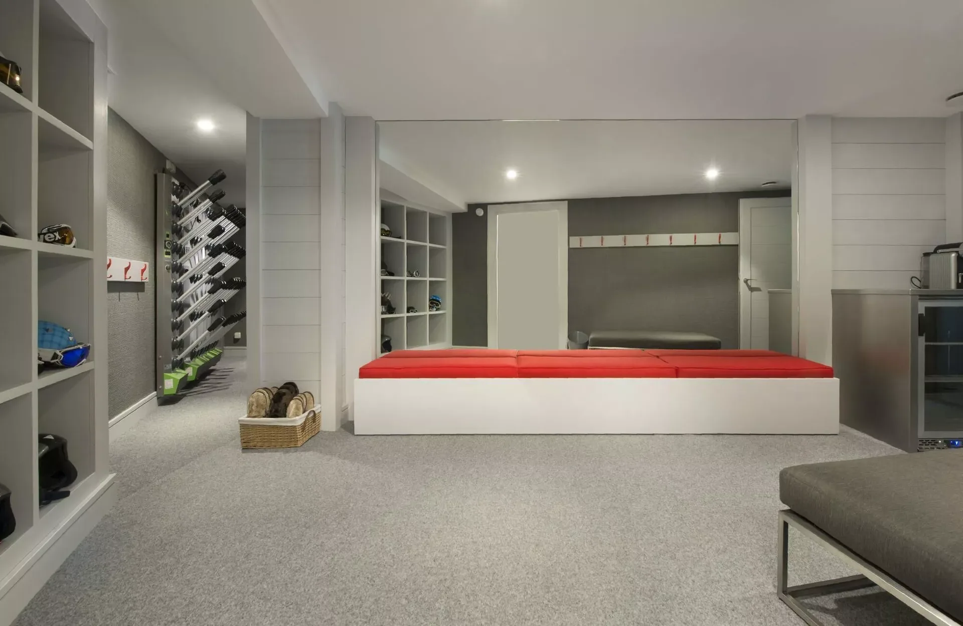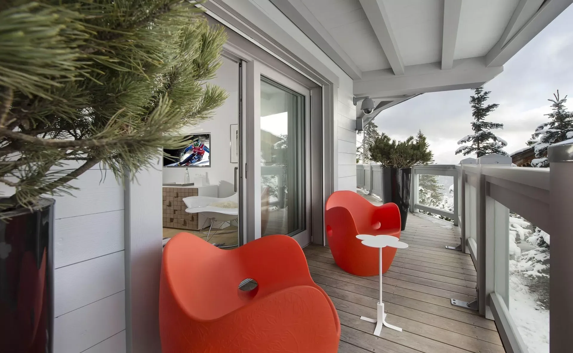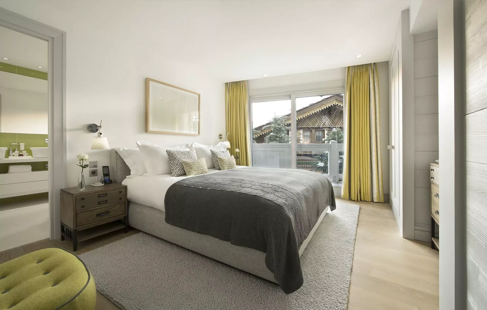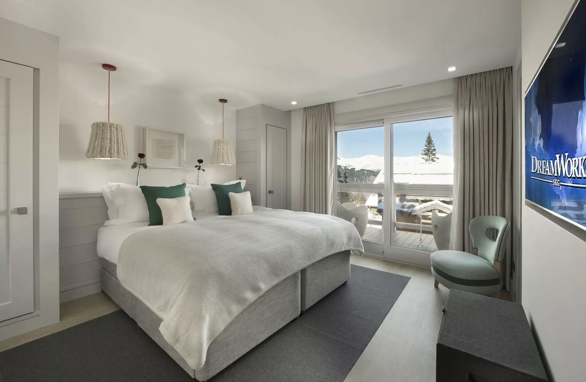 The chalet’s light grey modern silhouette blends seamlessly into the surrounding snow-covered landscape, while expansive tinted windows reflect the brilliance of the Alpine light. Inside, the décor reveals elegant Scandinavian inspirations, combining clean lines with the warmth of traditional mountain materials such as wood and stone. Knit wool cushions, graphic-patterned carpets, light woods, and designer furnishings create a refined yet inviting atmosphere.