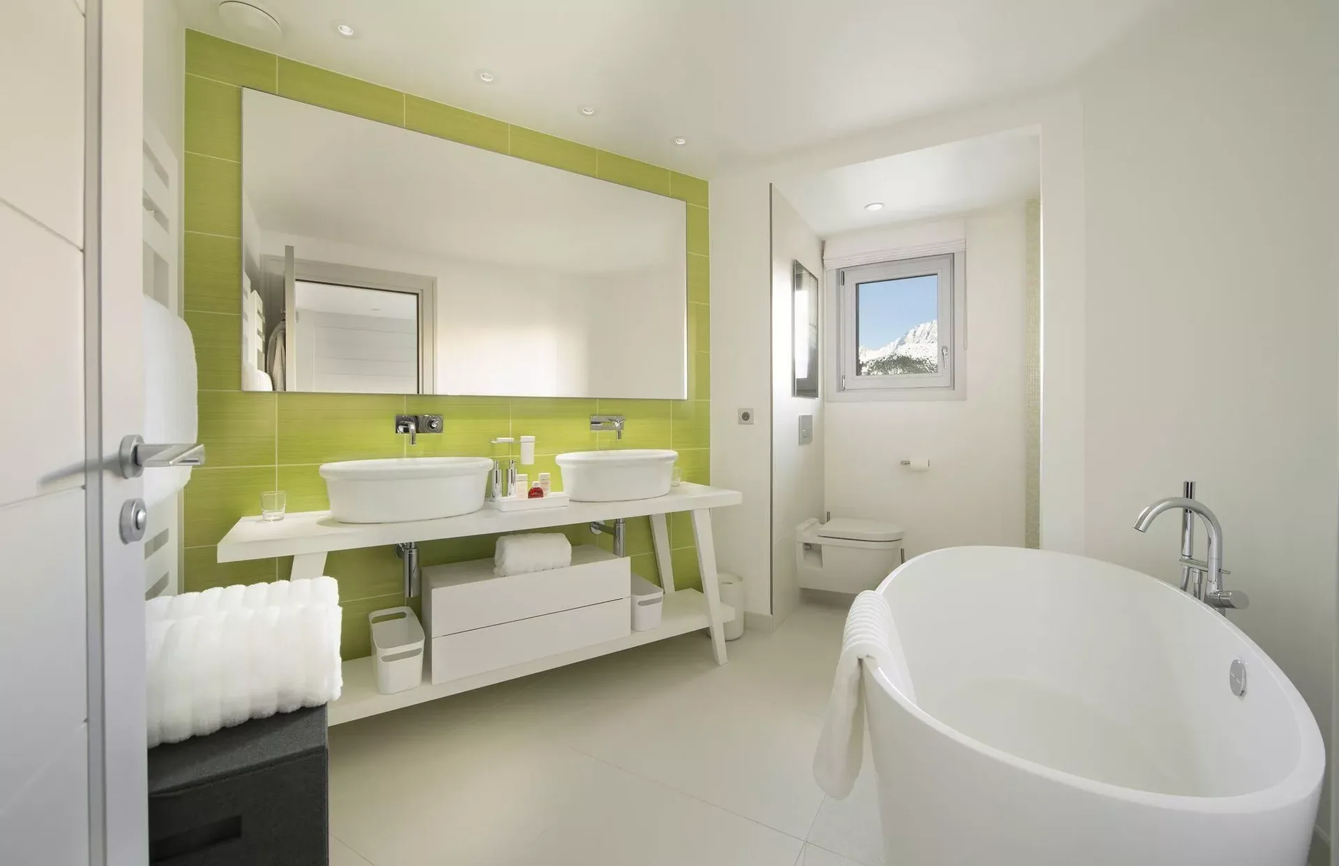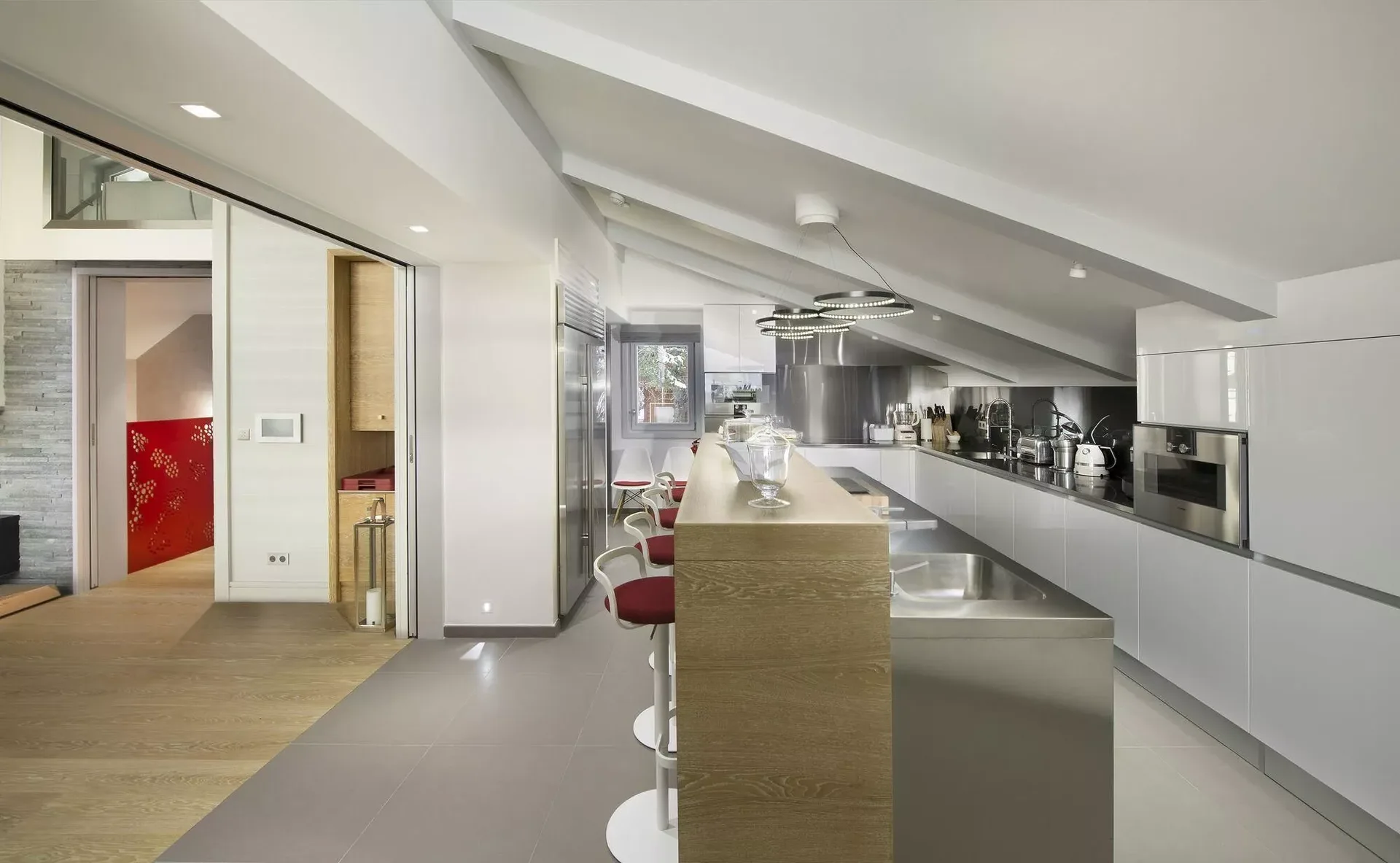 The main living space is designed for both relaxation and entertaining. Settle into a statement armchair by the glass-fronted fireplace, or gather around the large wooden dining table beneath striking designer lighting. Contemporary artworks add a modern twist to the classic alpine paneling, while the double-height ceiling and generous windows frame spectacular views over Courchevel and its surrounding peaks.