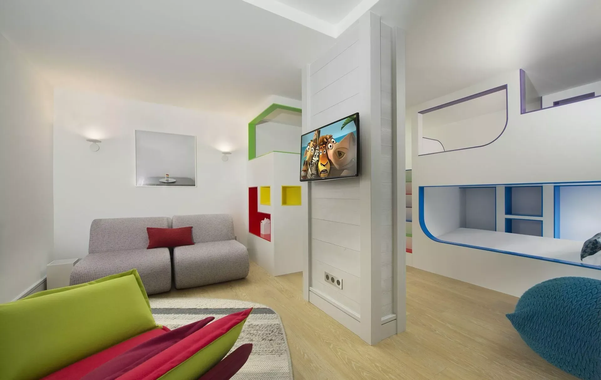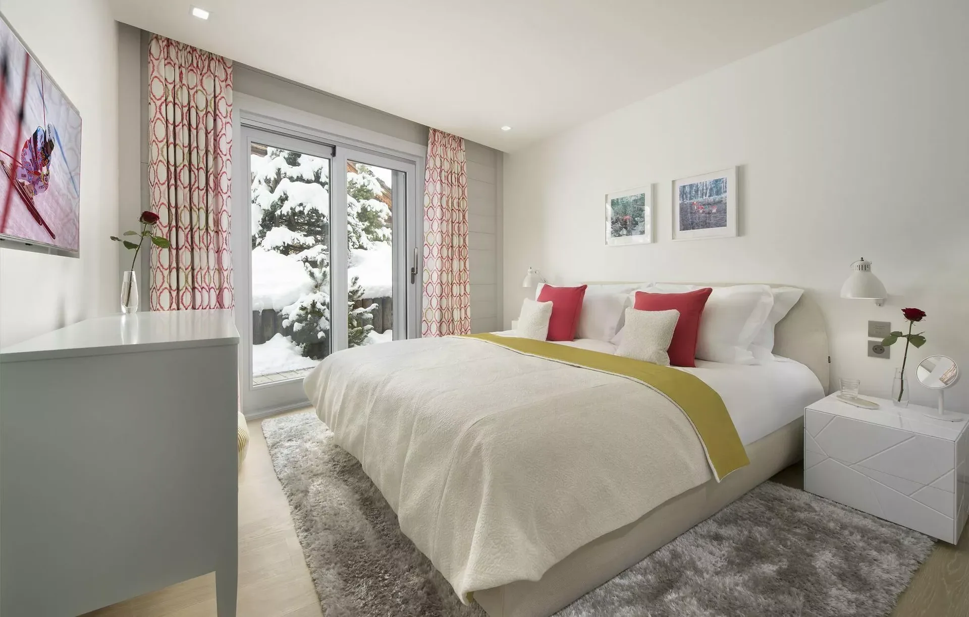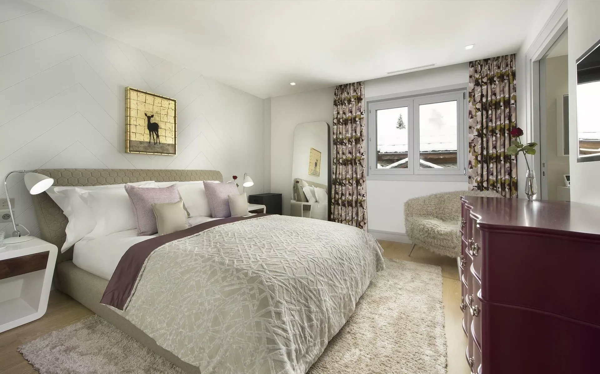 The chalet accommodates up to 14 guests across seven beautifully appointed bedrooms, including a dedicated children’s bedroom with four single beds. Each room features its own ensuite bathroom, TV, and elegant décor, enhanced by soft textures, warm lighting, and subtle touches of color that create a cozy and restful ambiance.